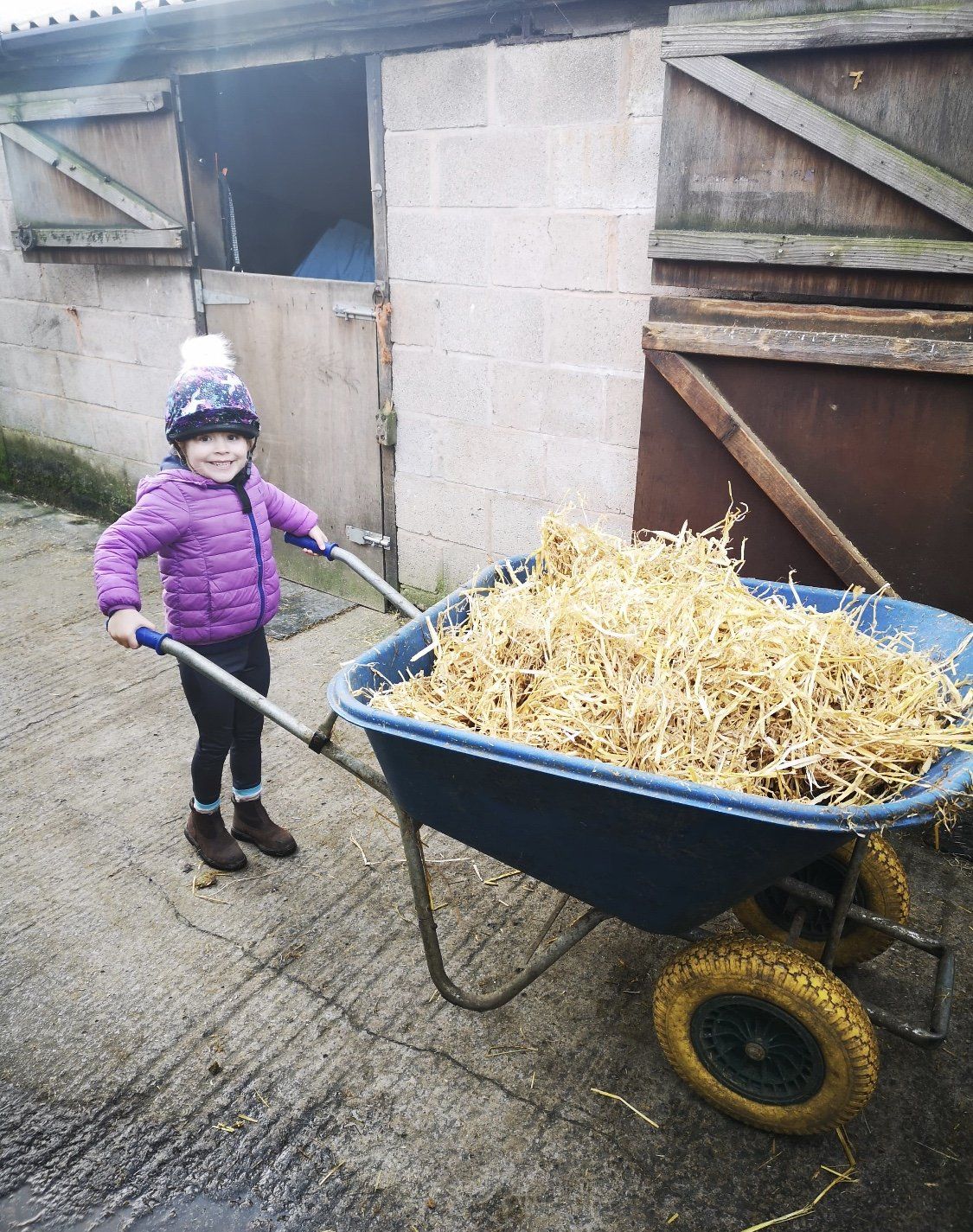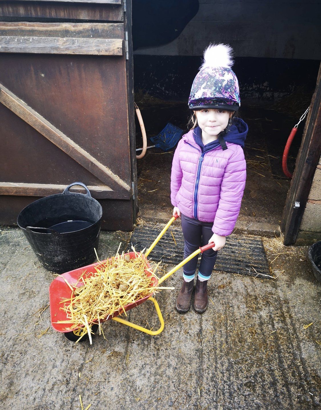 Hello Everyone my name is Penelope and I will be three in a couple of months. My pony is called Nelly and we are just starting to go out on hacks around our village. My mummy has a pony called Higgins. He is very fat and greedy! I help my Daddy to muck out and feed the ponies everyday since I was really tiny. We are very lucky to have such a nice Daddy! He also leads me out but sometimes he has to run because Nelly is very fast! We were hoping to go to our first show this summer but we are very sad that they might not happen now but we will have lots of extra time to practice. I hope you like my photos as you can see I love playing at the stables! Penelope and Nelly xx